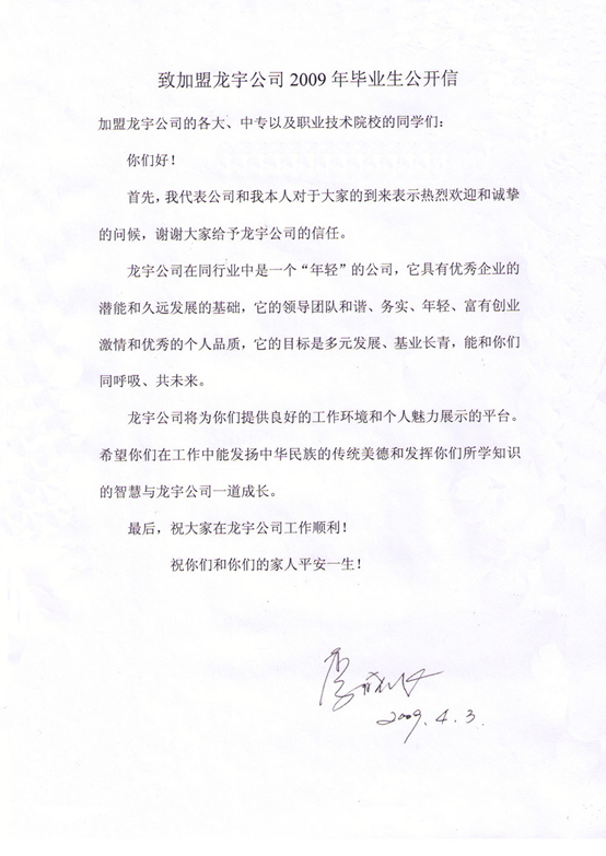 致加盟龍宇公司2009年畢業(yè)生公開(kāi)信