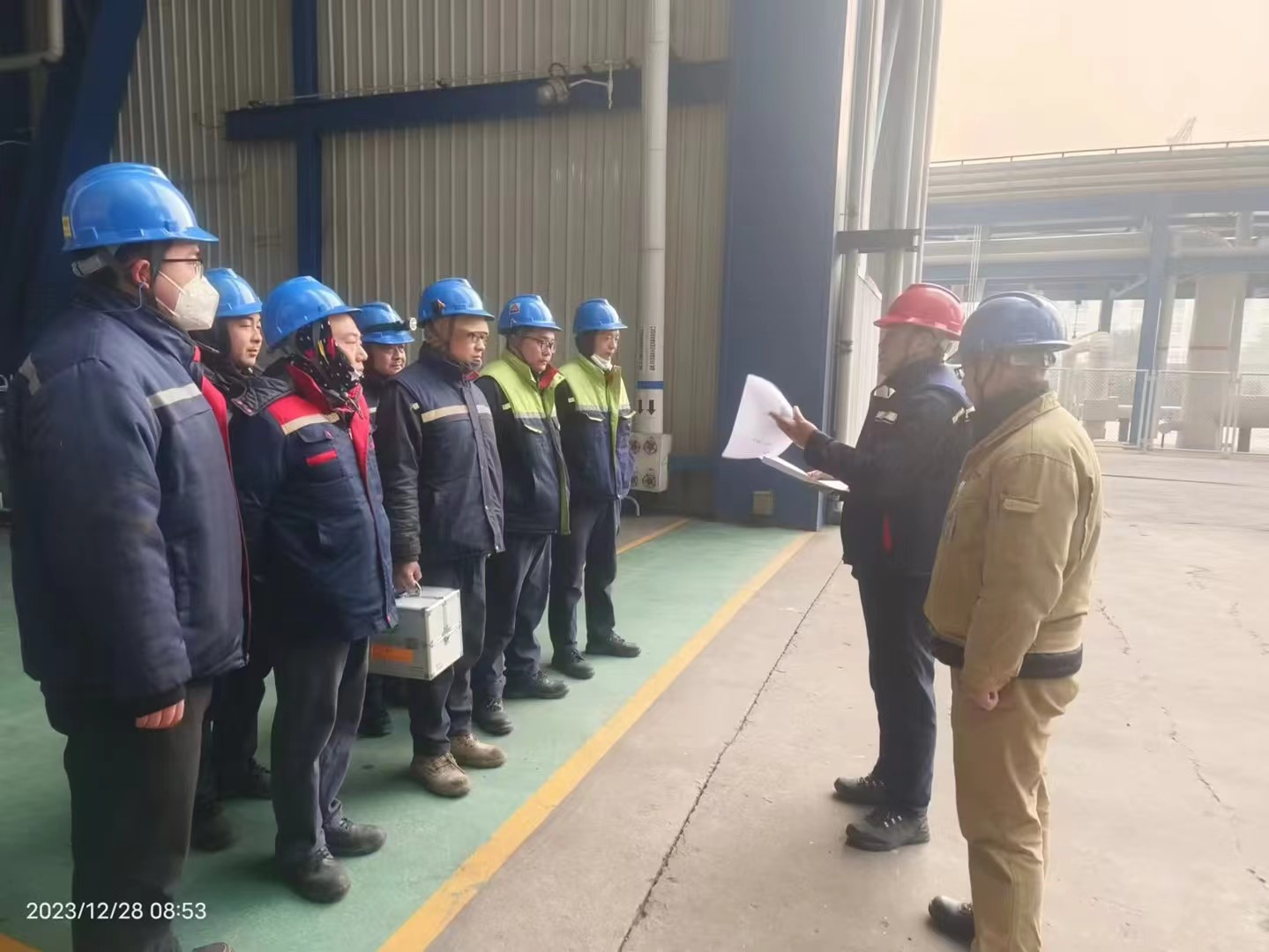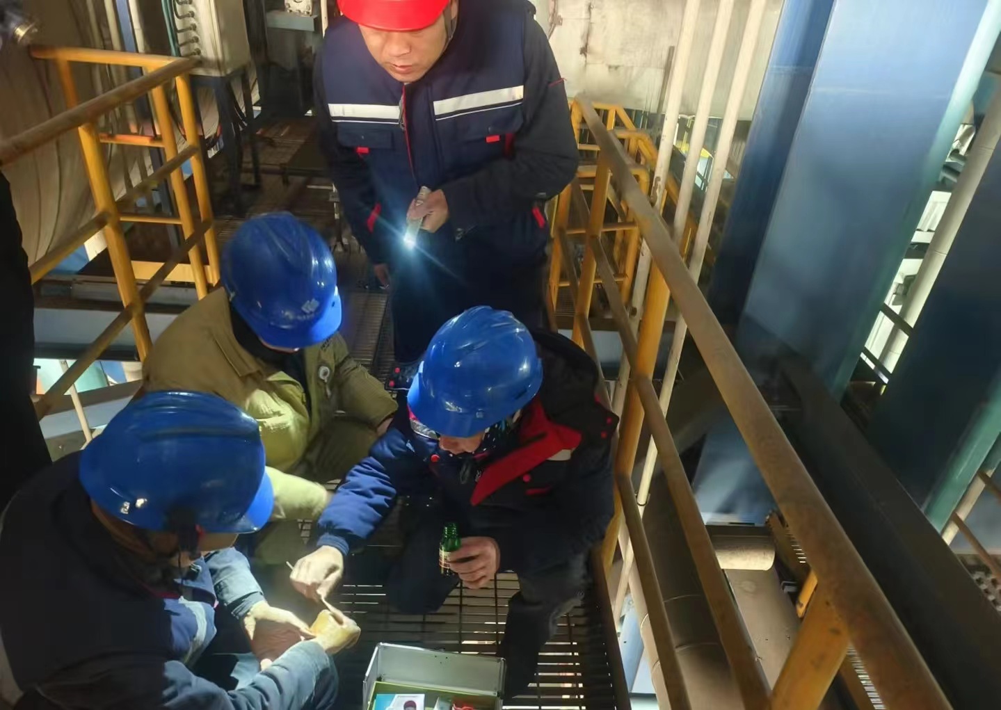 本次演練以熱風(fēng)插板門平臺改善工作為背景,工作班成員不慎跌倒,手部被熱風(fēng)插板門燙傷,總指揮宣布啟動應(yīng)急預(yù)案。按照預(yù)定方案進行有序處理,電話通知監(jiān)工與項目經(jīng)理,此時傷者因腿部扭傷無法自行逃生,工作班成員把傷者攙扶至安全地點,現(xiàn)場開展急救。消毒紗布包裹傷處,避免受感染,等待急救車的到來,去醫(yī)院做進一步檢查和治療。演練過程中各參演人員密切配合、團結(jié)協(xié)作,演練結(jié)束后,總指揮針對應(yīng)急預(yù)案及演練中暴露的問題與不足進行了點評。