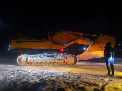 正月十一,我們開始了艱難的施工。這天的最低氣溫是零下37℃,就在這寒冷的寂靜中,轟鳴聲伴隨的少量的濃煙,我們的特殊專業(yè)設(shè)備鷹嘴鉤開始工作。令人驚喜的是,對于這種地面凍層,這臺鷹嘴鉤真不愧是專業(yè)設(shè)備,破碎凍土層的速度超過普通破碎機械的3倍以上,不到1小時就破碎出4米寬10多米長的一段路面。但由于凍土深度接近3米,鷹嘴鉤每次破碎所達到的深度最多只能達到1米左右,我們只能分層破碎:先破碎第一層,然后用挖機將第一層破碎后的凍土挖走,鷹嘴鉤再回過頭來進行第二層破碎,只有這樣才能把凍層完全破碎,但在這么殘酷的環(huán)境下這種工作效率已經(jīng)相當(dāng)喜人了。