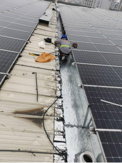 原水槽、水管、及光伏組件連接處多處漏水。在臺電要求下我方施工過程中多次處理原施工遺留的漏水問題,由于新水槽、水管還未安裝原漏水點(diǎn)無法根治,現(xiàn)場只能采取打膠、加支架等臨時措施處理漏水點(diǎn)。持續(xù)的大雨導(dǎo)致打完膠的位置膠始終處在潮濕環(huán)境下達(dá)不到本應(yīng)具備的性能,待下一場雨到來時還會漏雨,這樣的后果就是一直在做重復(fù)的打膠補(bǔ)漏工作。
