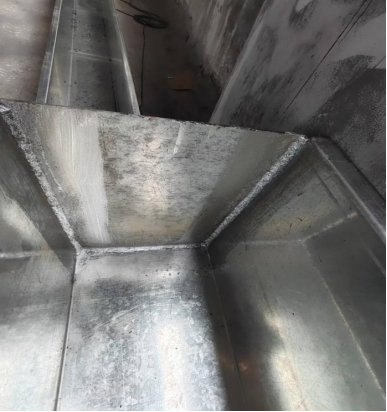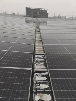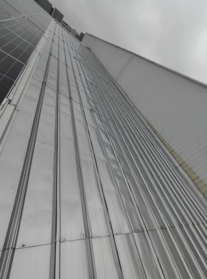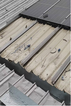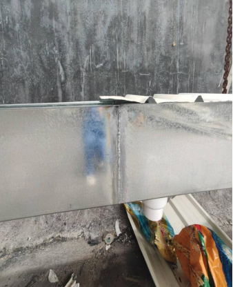 另有5條排水槽全部更換。原排水槽為1.2MM普通鐵板制作,采用搭接密封膠形式連接,密封不牢固導(dǎo)致雨水滲漏,水槽天溝沒有泛水板,與光伏板、金屬板相接處沒有防雨措施導(dǎo)致雨水滲漏。新更換水槽為3mm厚鍍鋅鋼板壓制成型,采用焊接方式連接,焊縫處刷漆防腐,水槽天溝兩側(cè)加裝泛水板,與光伏版及金屬板相接處使用防水泡沫封堵。共更換460米。